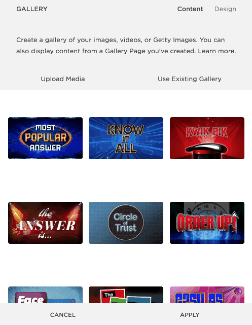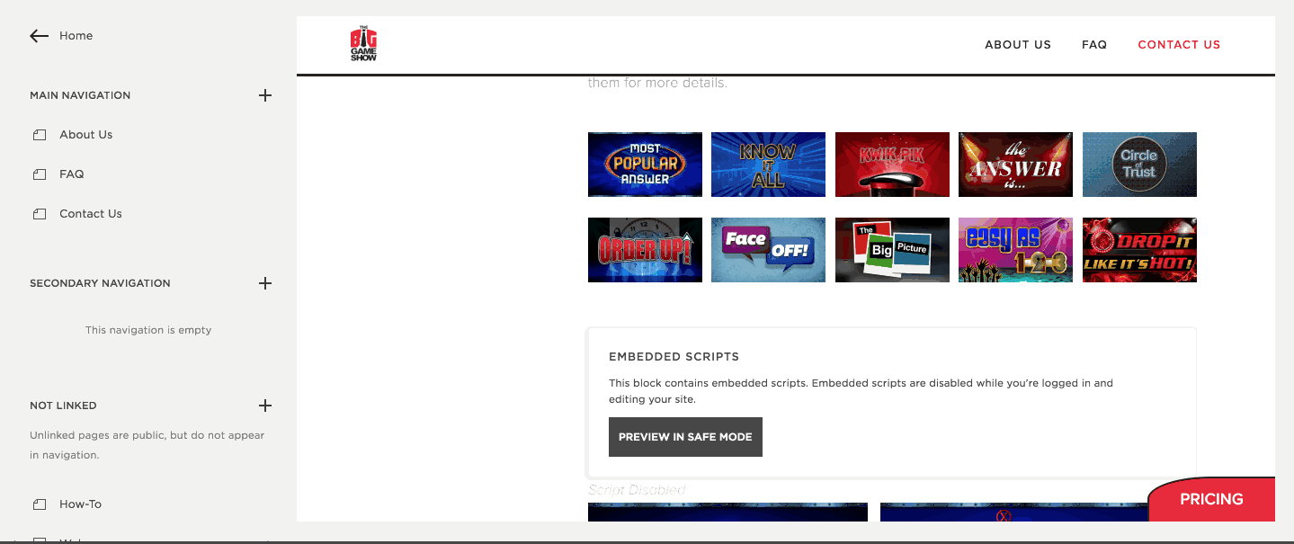<script> $(document).ready(function() { $('img').click(function() { var game_id = $(this).attr('alt'); $('#mpa, #kia, #kp, #tai, #cot, #ou, #fo, #tbp, #ea, #di, #NEW_GAME').addClass('hide'); $('#' + game_id).removeClass('hide'); $('html, body').stop().animate({ scrollTop: $('#faq-img-wrapper').offset().top - 100 }, 1000); }); }); </script> <div id="faq-img-wrapper"> <div id="mpa" class="faq" style="clear:both;"> <img src="/s/mpa1.jpg" id="faq-img1"><img src="/s/mpa2.jpg" id="faq-img2"><p style="clear:both;"><strong>Most Popular Answer</strong> is inspired by the TV show Family Feud, with our own variations (including original music, graphics and rules). Teams battle to try and come up with the top answers to fun questions.</p> </div> <div id="NEW_GAME" class="faq hide" style="clear:both;"> <img src="/s/NEW_GAME1.JPG" id="faq-img1"><img src="/s/NEW_GAME2.JPG" id="faq-img2"><p style="clear:both;"><strong>NEW_GAME1.JPG should be the name of your title slide for the game. NEW_GAME2.JPG should be your second game slide.</p> </div> <div id="kia" class="faq hide"> <img src="/s/kia1.jpg" id="faq-img1"><img src="/s/kia2.jpg" id="faq-img2"><p style="clear:both;"><strong>Know It All</strong> is inspired by the TV show JEOPARDY!, with our own variations (including original music, graphics, and rules). For instance, each of the four “Player” positions can be manned by up to three people, so a total of 12 can play at once.</p> </div> <div id="kp" class="faq hide"> <img src="/s/kp1.jpg" id="faq-img1"><img src="/s/kp2.jpg" id="faq-img2"><p style="clear:both;">Everyone pays close attention during <strong>Kwik Pik</strong>. The computer randomly selects from a pre-populated list. It’s perfect for giving away prizes during a raffle or otherwise.</p> </div> <div id="tai" class="faq hide"> <img src="/s/tai1.jpg" id="faq-img1"><img src="/s/tai2.jpg" id="faq-img2"><p style="clear:both;">In <strong>The Answer Is…</strong>, two people compete head-to-head. We reveal three possible answers first, and then the question. The first person to buzz in gets to guess.</p> </div> <div id="cot" class="faq hide"> <img src="/s/cot1.jpg" id="faq-img1"><img src="/s/cot2.jpg" id="faq-img2"><p style="clear:both;"><strong>Circle of Trust</strong> is inspired by the game Pyramid, with our own variations (including original music, graphics and rules). Two people are on a team, but only one can see the screen. It is that person’s job to describe a word that appears to his or her teammate. They guess as many words as possible while the clock is ticking.</p> </div> <div id="ou" class="faq hide"> <img src="/s/ou1.jpg" id="faq-img1"><img src="/s/ou2.jpg" id="faq-img2"><p style="clear:both;"><strong>Order Up</strong> has four teams of 2, 3, or 4 people (it’s flexible). You can have fewer teams if desired. Teams are shown four items and then asked to put them in a certain order. Teams have 25 seconds to talk about it. For each item that a team gets in the correct position, 100 points is awarded.</p> </div> <div id="fo" class="faq hide"> <img src="/s/fo1.jpg" id="faq-img1"><img src="/s/fo2.jpg" id="faq-img2"><p style="clear:both;"><strong>Face Off</strong> is for the entire audience. We ask a question, and the correct answer is either on the left side of the screen or on the right. Each person in the audience casts their vote by turning to the left or to the right. After five seconds, we reveal the answer. Everyone facing the correct direction remains in the game, while everyone else has a seat. We continue until the winner(s) is left standing.</p> </div> <div id="tbp" class="faq hide"> <img src="/s/tbp1.jpg" id="faq-img1"><img src="/s/tbp2.jpg" id="faq-img2"><p style="clear:both;"><strong>The Big Picture</strong> is inspired by the popular matching game of Concentration. Pick two tiles that match each other and they disappear, partially revealing a “big picture” behind them. In this game, we work the crowd by moving around the room and asking random people to give it their best shot.</p> </div> <div id="ea" class="faq hide"> <img src="/s/ea1.jpg" id="faq-img1"><img src="/s/ea2.jpg" id="faq-img2"><p style="clear:both;"><strong>Easy As 1-2-3</strong> involves everyone. First of all, everyone in the audience picks a teammate (and it’s okay if teams end up with three people). We ask a question, and the correct answer is always 1, 2, or 3. Teams hold up the number of hands they think corresponds to the correct answer. After 7 seconds we reveal the answer and teams that are right stay in the game.</p> </div> <div id="di" class="faq hide"> <img src="/s/di1.jpg" id="faq-img1"><img src="/s/di2.jpg" id="faq-img2"><p style="clear:both;"><strong>Drop it Like it’s Hot</strong> has four teams of 2, 3, or 4 people (it’s flexible). Teams are shown a multiple choice question and have 15 seconds to talk about it. They are then allotted a fixed amount of points they can wager on each answer. One-by-one incorrect answers drop off the screen along with any points they had wagered on that answer.</p> </div> </div> <style> .hide { display:none; } #faq-img1, #faq-img2 { float:left; width:46%; margin-right:2%; margin-bottom:2%; } .faq strong { color: #E8222F; } </style>